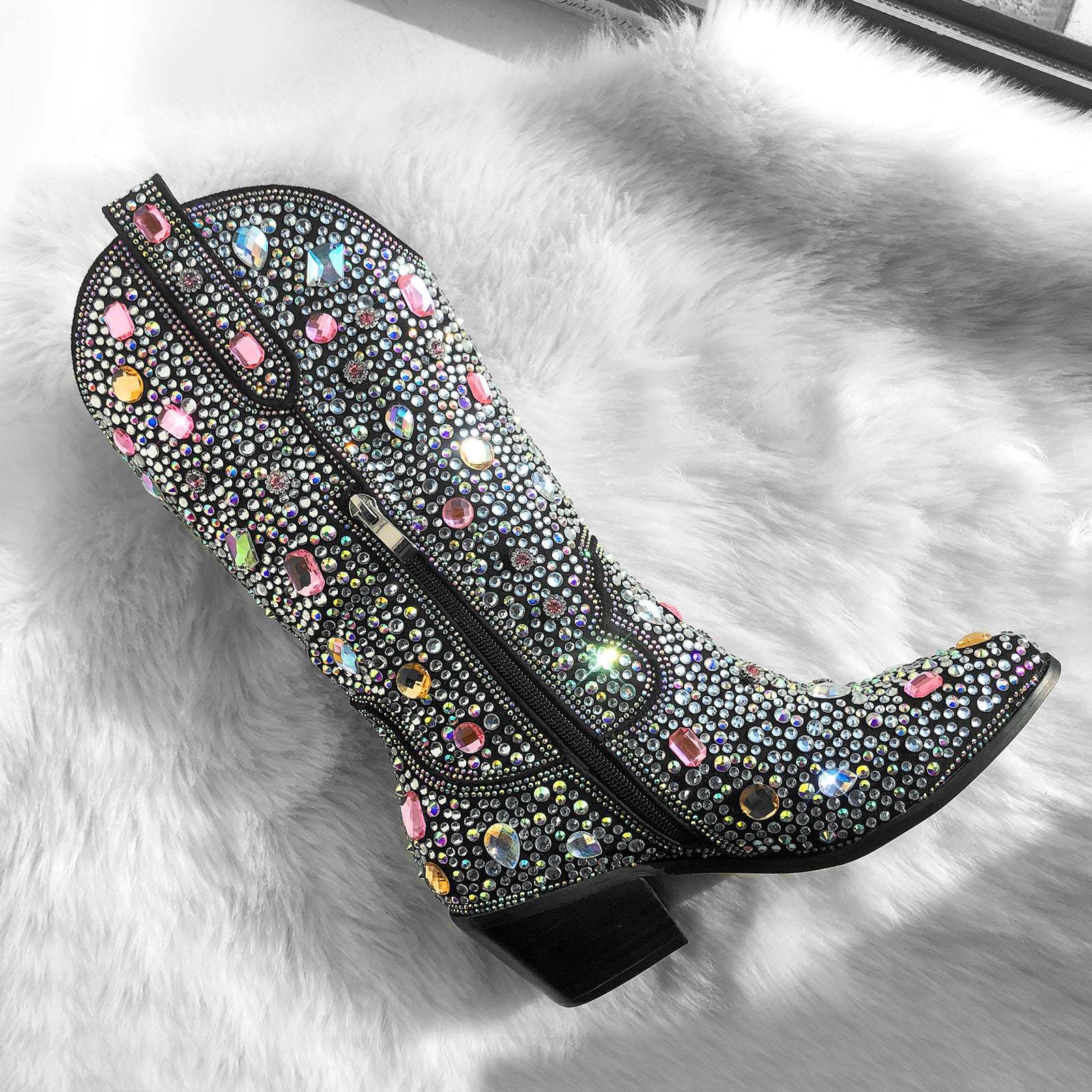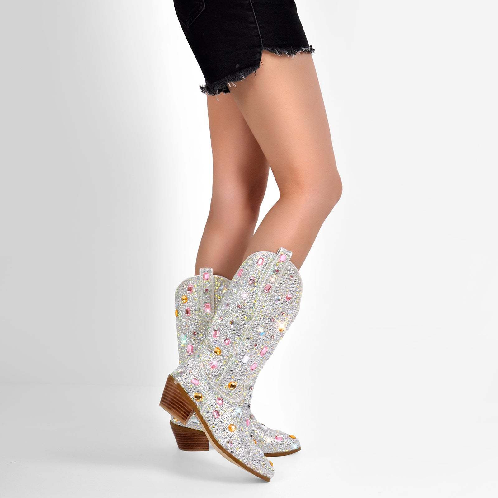 Unsere glänzenden Westernstiefel mit Trichterabsatz sind ein eleganter Hingucker. Die verzierten Schmucksteine und Strass-Details verleihen diesen Langschaft-Stiefeln eine Extraportion Glamour. Perfekt für den Cowboy-Boots-Look mit einem Hauch von Luxus. Erobere die Blicke bei jedem Schritt