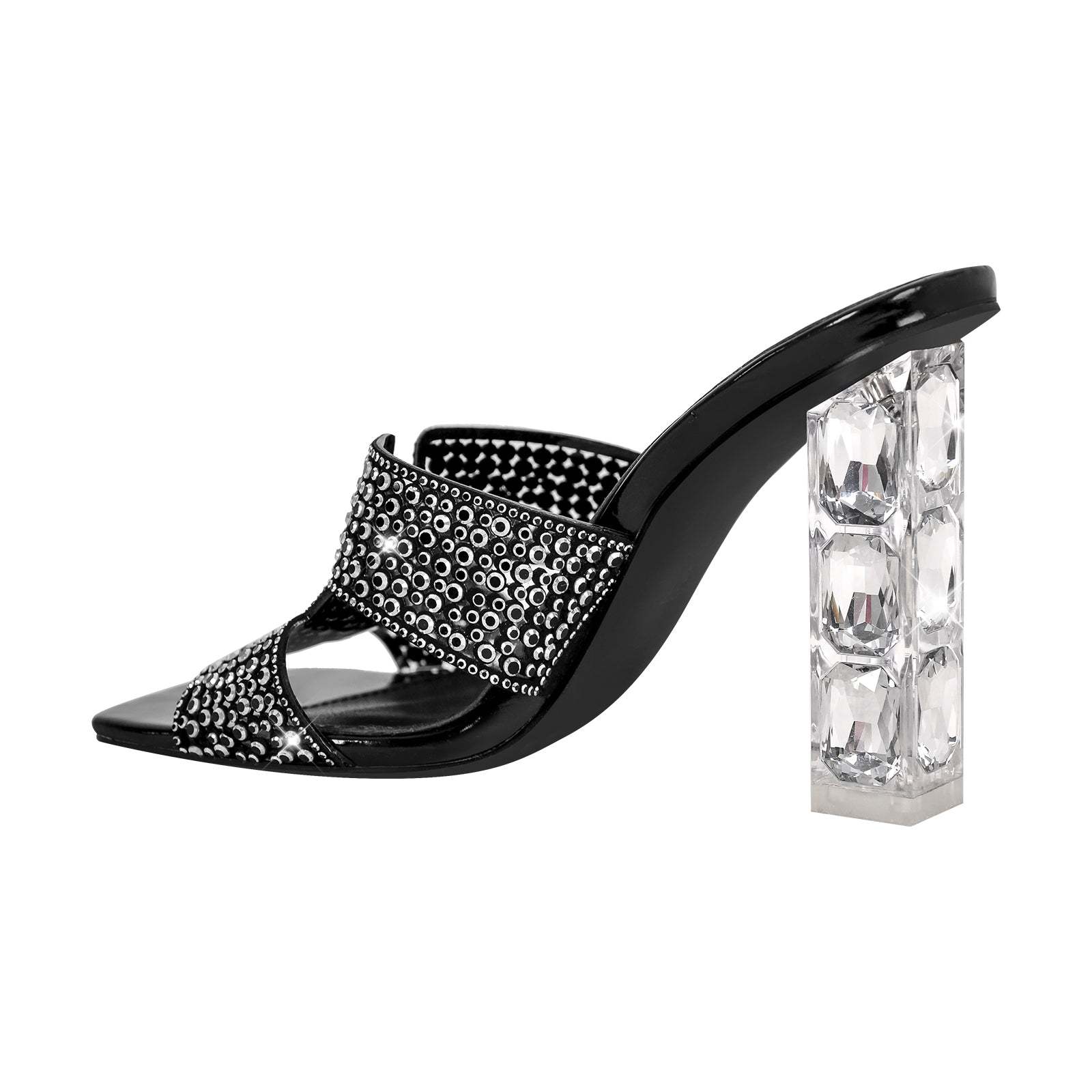 Unsere Pantoletten mit Kristall-Blockabsatz sind die perfekte Kombination aus Komfort und Eleganz. Die verzierten Schmucksteine verleihen diesen Slip-On Sandalen eine funkelnde Note. Ein stilvoller Begleiter für besondere Anlässe und entspannte Tage.