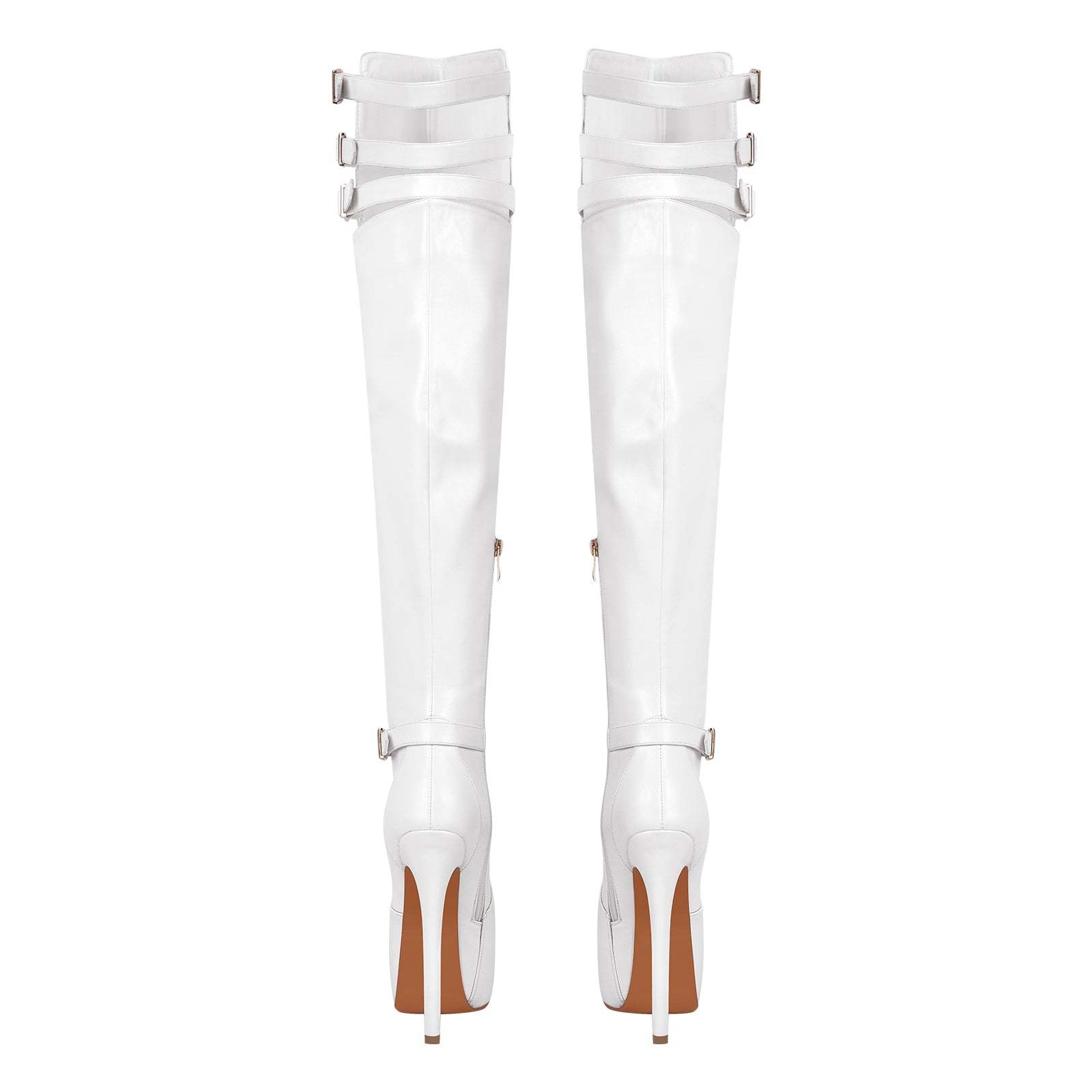 Plateau Overknee Pfennigabsatz verzierte Schnallen Skelettschnitzerei Stiletto Boots