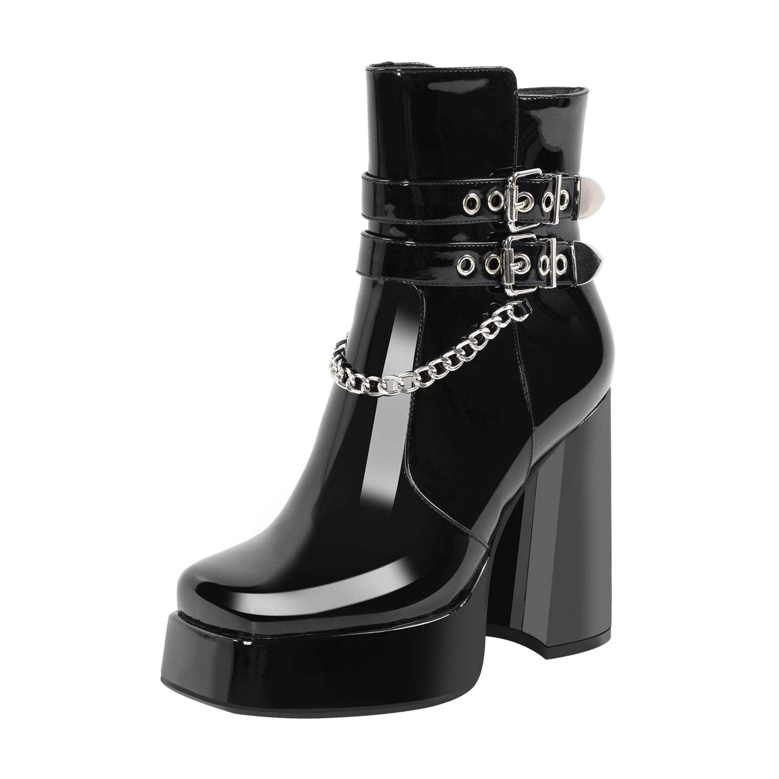 Plateau Stiefeletten verzierte Schnallen Metallketten Knöchelstiefel Blockabsatz